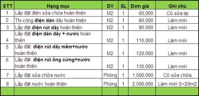 - Định mức vật tư cơ bản (ống, dây, phụ kiện) theo tuyến trung bình.